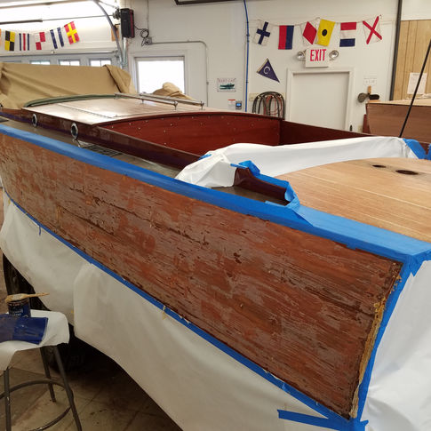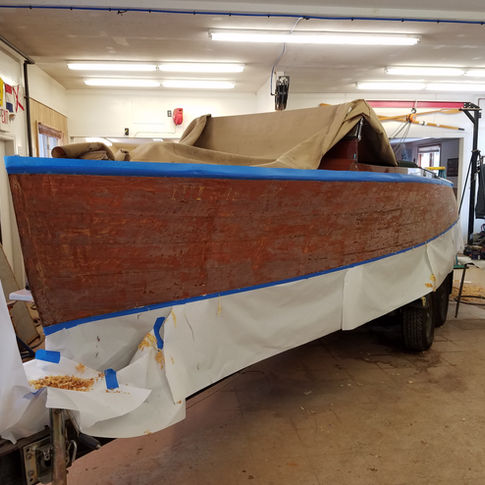 Golden Sunshine (named after the owners' Golden Retriever named Sunshine), had some rot in a couple of the side planks and was in need of refinishing. The owner preferred to take the job in steps so at this time we are removing one side plank and part of two others to address the rot issue, and refinishing the sides and aft deck.